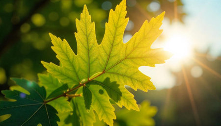 Bright green leaf illuminated by sunlight in a serene garden during early morning hours