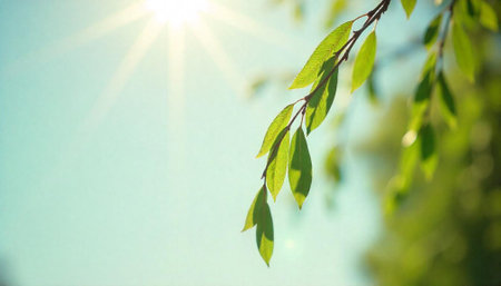 Sunlight Through Spring Foliage Backlit Branch with Vibrant Green Leaves, Defocused Background