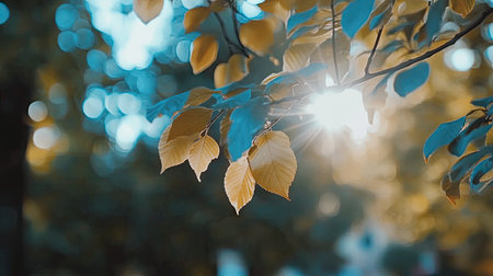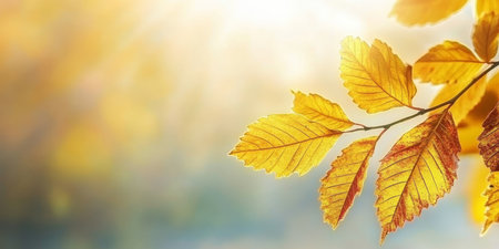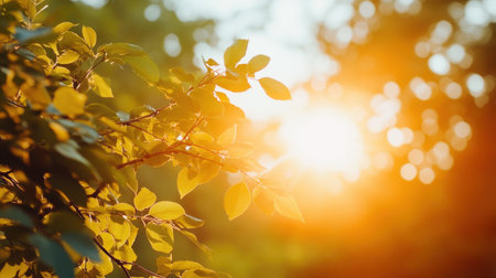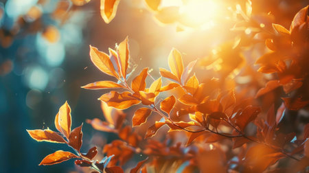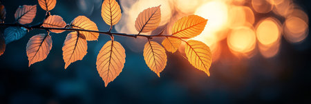 Golden Hour Glow Backlit Autumn Leaves on Branch with Dreamy Bokeh, Nature Background