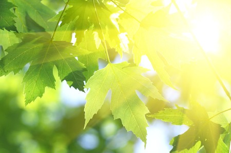 A closeup of a fresh green maple leaf scene with the sunshine peering thru the foliage.