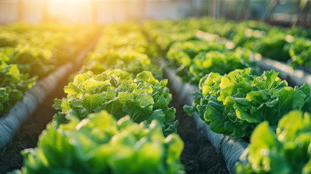 Vibrant green lettuce plants grow in rich soil under warm sunlight, showcasing the beauty of agriculture and the freshness of healthy produce in the farm field.