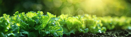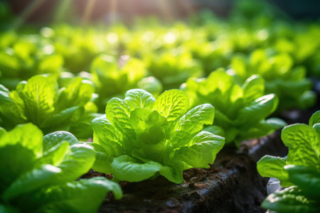 Vibrant green lettuce heads flourish in natural sunlight on an organic farm. This scene reflects healthy living and sustainable farming practices, showcasing the beauty of nature and fresh produce.