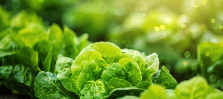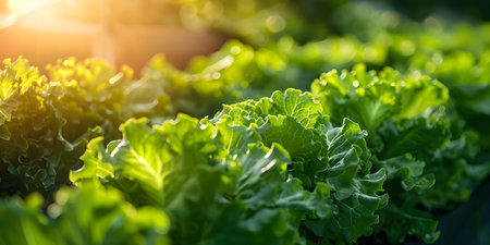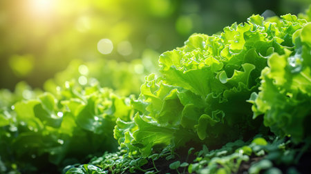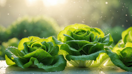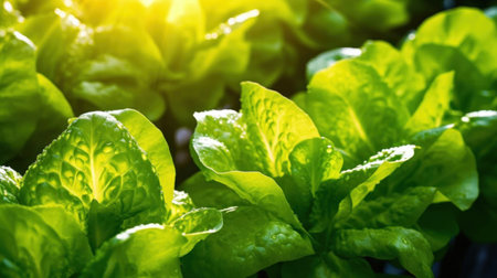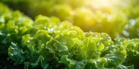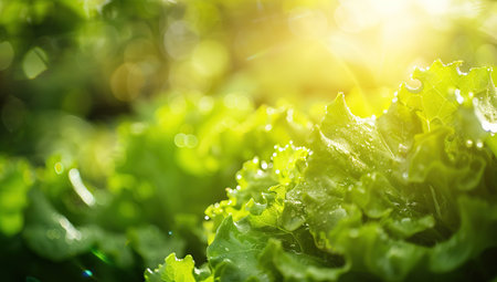Close-up image of fresh green lettuce leaves covered in dew drops, illuminated by soft sunlight, showcasing natural beauty and promoting healthy eating and lifestyle.