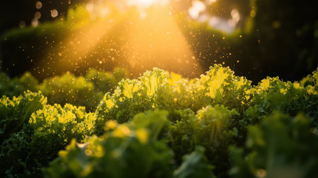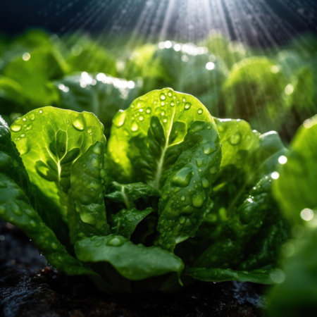 A captivating scene of sunlight filtering through vibrant green lettuce leaves, with gentle water droplets creating a serene outdoor atmosphere. Perfect for nature themes.
