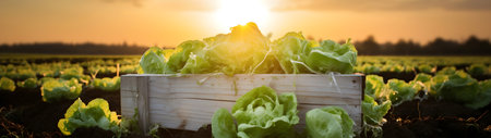 Iceberg lettuce in a wooden box with field and sunset in the background. Natural organic fruit abundance. Agriculture, healthy and natural food concept. Horizontal composition, banner.