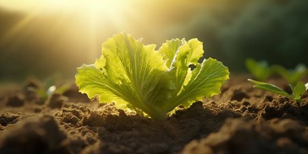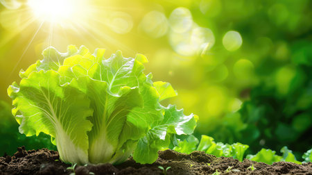 A vibrant image showcasing fresh green lettuce growing in nutrient-rich soil under warm sunlight, emphasizing the beauty of nature and healthy living.