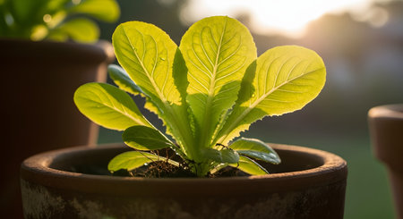 A young, vibrant green lettuce seedling growing in a terracotta pot. The plant's leaves are beautifully backlit by the warm, golden sunlight of either sunrise or sunset, highlighting its delicate veins and fresh dew. The image represents new life, growth, and urban gardening.