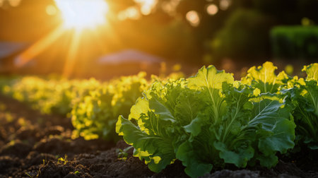 Fresh lettuce growing in a vibrant vegetable garden during golden hour light