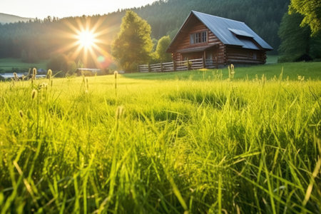 morning light hitting a wooden lodge, groundhogs visible in the grass, created with generative ai