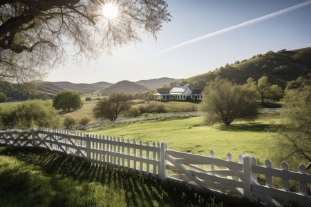 expansive view of rolling hills, bordered by white picket fences, created with generative ai
