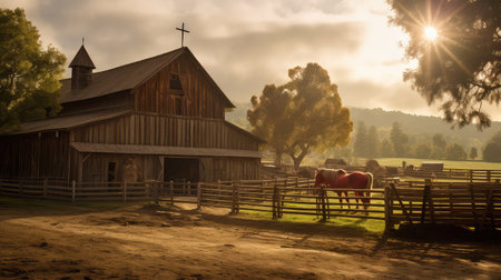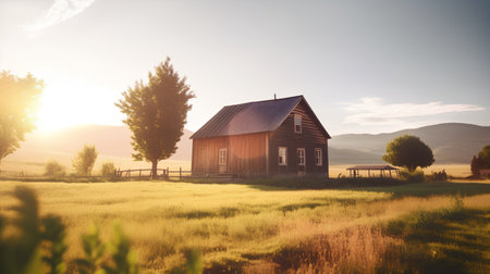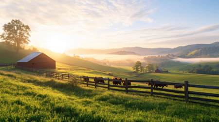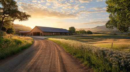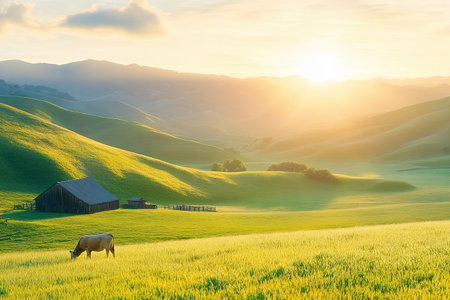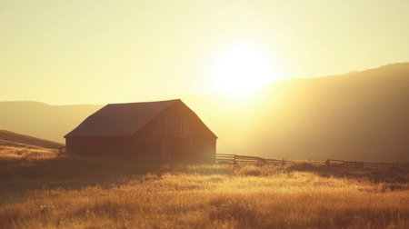 A peaceful sunrise casts a warm glow over a rustic barn nestled in golden meadows, surrounded by rolling hills. Ideal for illustrating nature and tranquility.