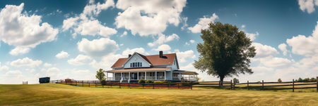 Panoramic view of farm house on green meadow and blue sky with clouds