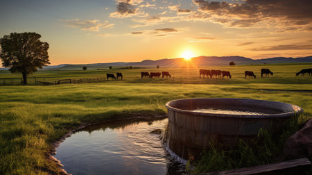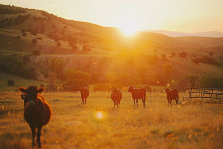 A tranquil ranch scene at sunset featuring cows grazing peacefully on golden fields. Beautiful hills and trees create a serene rural atmosphere.