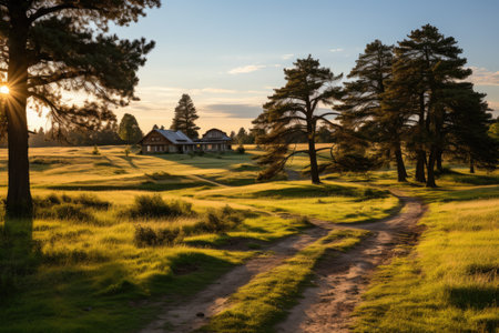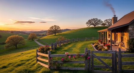 Beautiful sunset illuminates serene countryside home surrounded by vibrant flowers and lush greenery. warm light casts golden hue over landscape, creating peaceful and inviting atmosphere