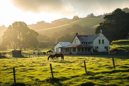 A tranquil country farmhouse with horses grazing in the field AI generated
