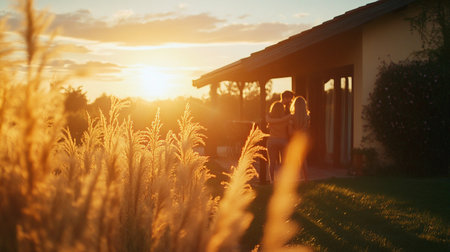 Family enjoying a sunset gathering on a backyard near the modern house. Three friends embrace on a porch as the sun sets, casting a warm glow over the cottage and surrounding landscape in a village.