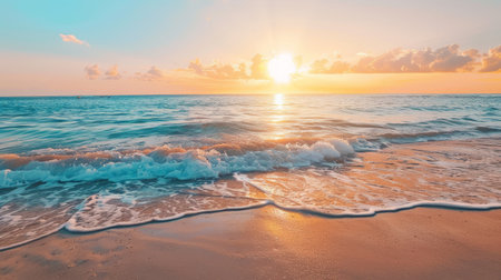 Serene beach sunrise with gentle ocean waves, calming seascape. Nature tranquility and relaxation concept
