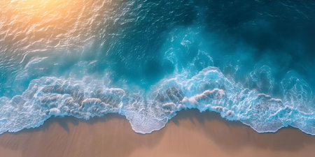 This breathtaking view captures the tranquil ocean waves meeting the soft sandy shore during sunrise, showcasing vibrant blue waters and gentle foamy edges along the beach.
