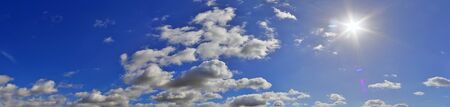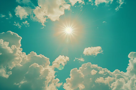Blue sky with white clouds and sun. Nature background. Vintage style.