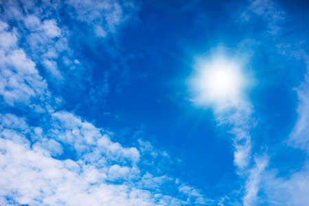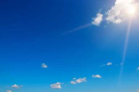 Sun Blue sky background with white clouds.Cloudscape. Sunny day. Cumulus white cloud.