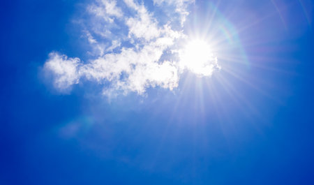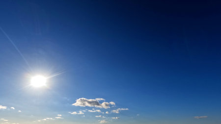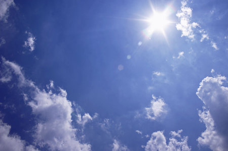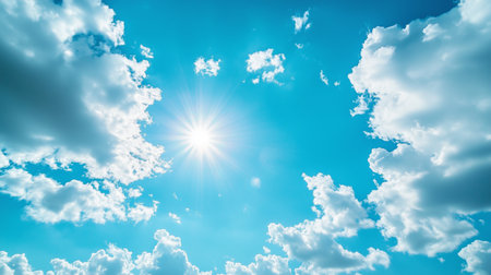 Fluffy white clouds frame the left side of a deep blue sky while the sun shines brightly with a starburst effect. A dramatic skyscape abstract background with large copy space.