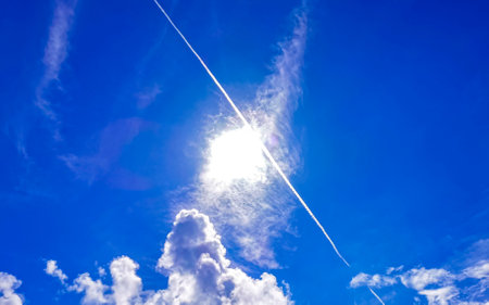 Blue sky with chemical clouds chemical sky and chemtrails chemtrail on sunny day in Playa del Carmen Quintana Roo Mexico.