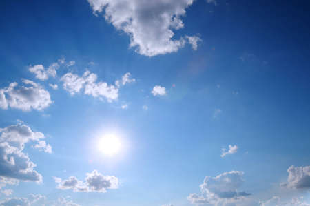 The clear blue sky with clouds and sun