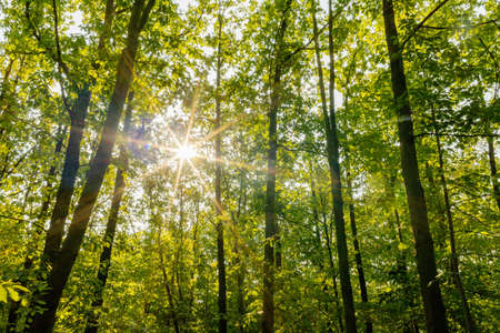 Morning in the deciduous forest. Rays of the sun. August among the trees. Europe, Poland, Mazovia.