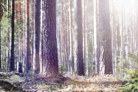 Coniferous Pine Forest with Sunlight through the Trunks of Trees. Toned