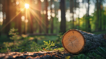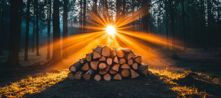 Golden Hour in the Enchanted Forest Pile of Firewood Bathed in Magical Light Beams from Setting Sun