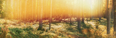 Sun Shining Through Forest Trees Woods. Sunset Sunrise In Summer Forest Landscape. Panoramic Pine Forest On Bright Sunny Autumn Day. Forest Bathed In Sun. Copy Space, Copy-space. Merry Autumn Season