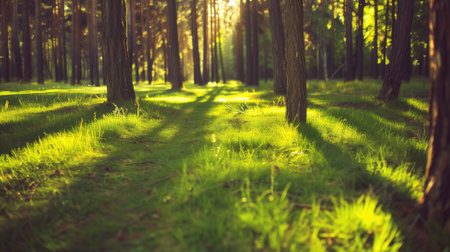 background blur Natural wooden front view. Spring woodland concept. Sunrise in spring park background. backlight Design transformation of space. peaceful daylight wallpaper.