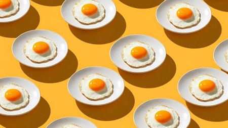 An arrangement of fried eggs on white plates on a bright yellow surface
