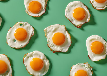 Fried eggs on a vibrant green background, showcasing a playful arrangement Perfect for food photography, breakfast themes, or cooking concepts in bright colors