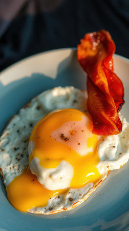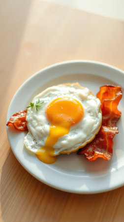 Breakfast plate with sunny side up egg and crispy bacon on wooden table
