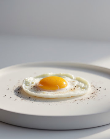 A freshly fried egg with a bright yellow yolk sits on a smooth white plate. Black pepper is sprinkled on top, highlighting its simplicity. This dish is ideal for a wholesome breakfast.