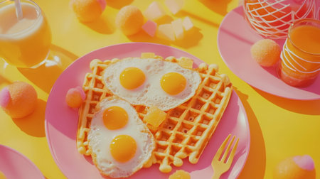 Enjoy a delightful breakfast scene featuring fluffy waffles topped with sunny side up eggs, vibrant colors, and playful decor, perfect for morning meals.