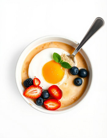 Bowl of oatmeal porridge with fresh berries and fried egg