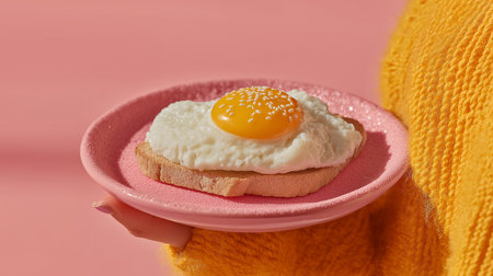 A sunny-side-up egg rests on a vibrant pink surface, featuring a yellow yolk designed with a smiley face. Light powder is artfully scattered around, adding a playful touch to the presentation.