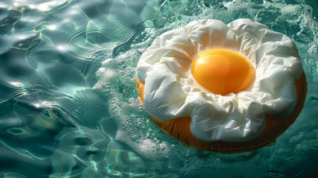 An inflatable mattress in the shape of a fried egg in a pool of turquoise water.