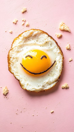 A perfectly fried egg featuring a cheerful smiley face formed by the yolk sits against a soft pastel background. Crumbs scattered around enhance the playful food presentation.
