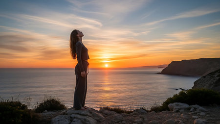 Serene woman on cliffside at sunset.