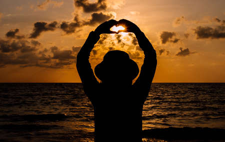 Silhouette of Heart shape being made by young woman hands with sunlight on beach. Sunset at the sea. Hand-made heart in love concept.