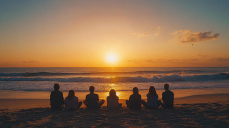 Group of friends sitting in a V formation on a beach, enjoying a sunset with their backs to the camera, waves gently crashing on the shore
