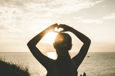 A hindu woman silhouette with making heart shape by keeping the sun between her hands on the seashore.