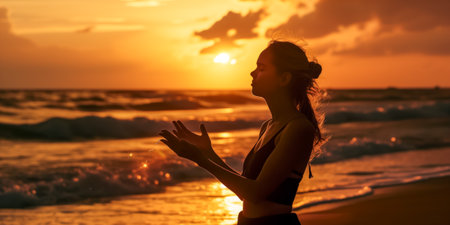 A serene woman meditating on a beach during sunset, creating a peaceful and contemplative atmosphere
