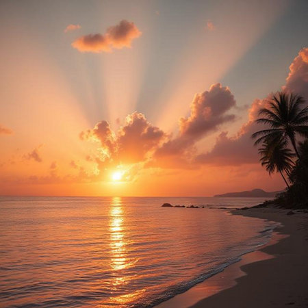 Sunset on the beach with palm trees and rays of light.
