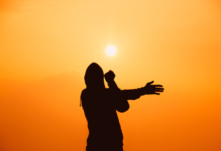 Silhouette of a man against the background of the sun and yellow at sunset sky. Hands are raised up to the sun.