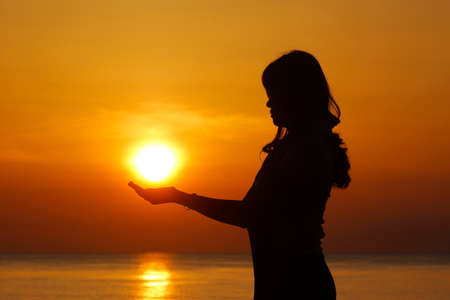 A young boy in a pool enjoying the sunset. Human silhouette over the setting sun. Holding sun in hand. Seascape. Copy space banner. Beautiful sky background. Balance.