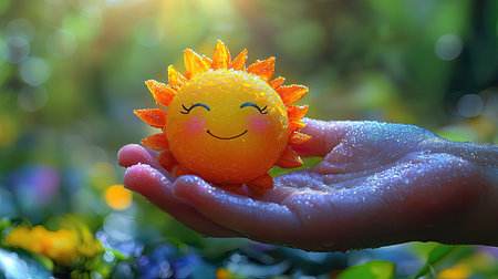 A sun with a smiling face wearing sunglasses and surrounded by a splash of sunbeams. Generative AI